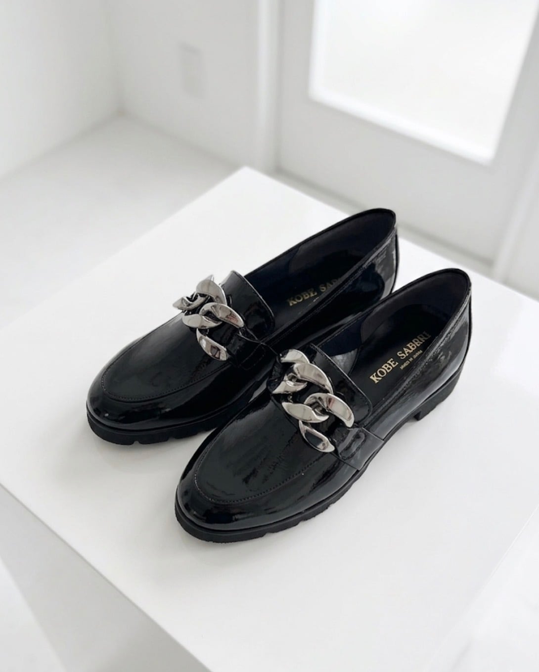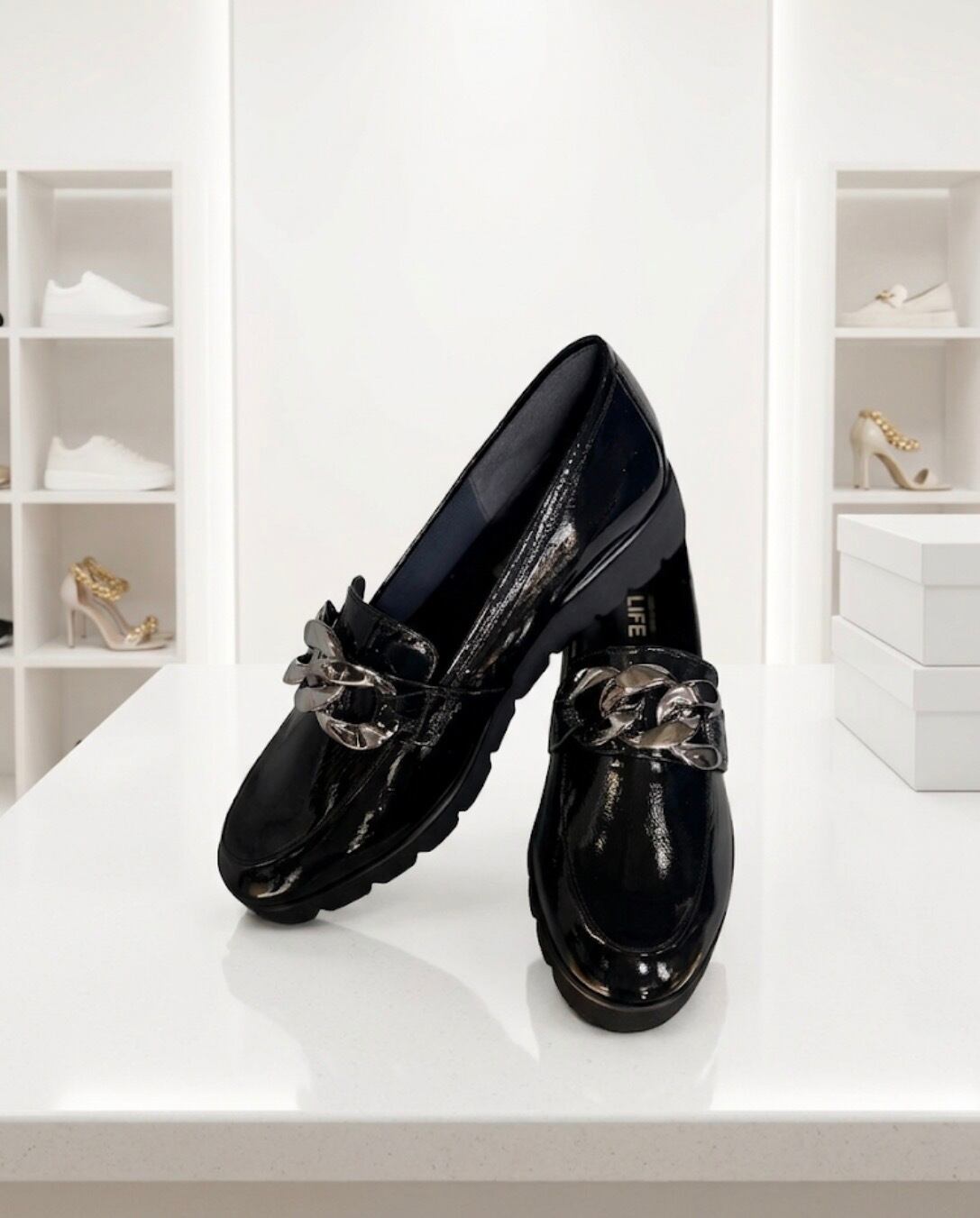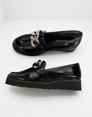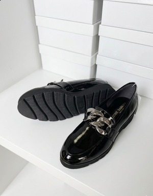 チェーンの色が少し明るくなってライトシルバーになりました。履き心地は軽くて履いていないかのように楽!柔らかいエナメルなので足馴染みがとっても良い1足!お色違いでシルバーもございます。(品番9654)