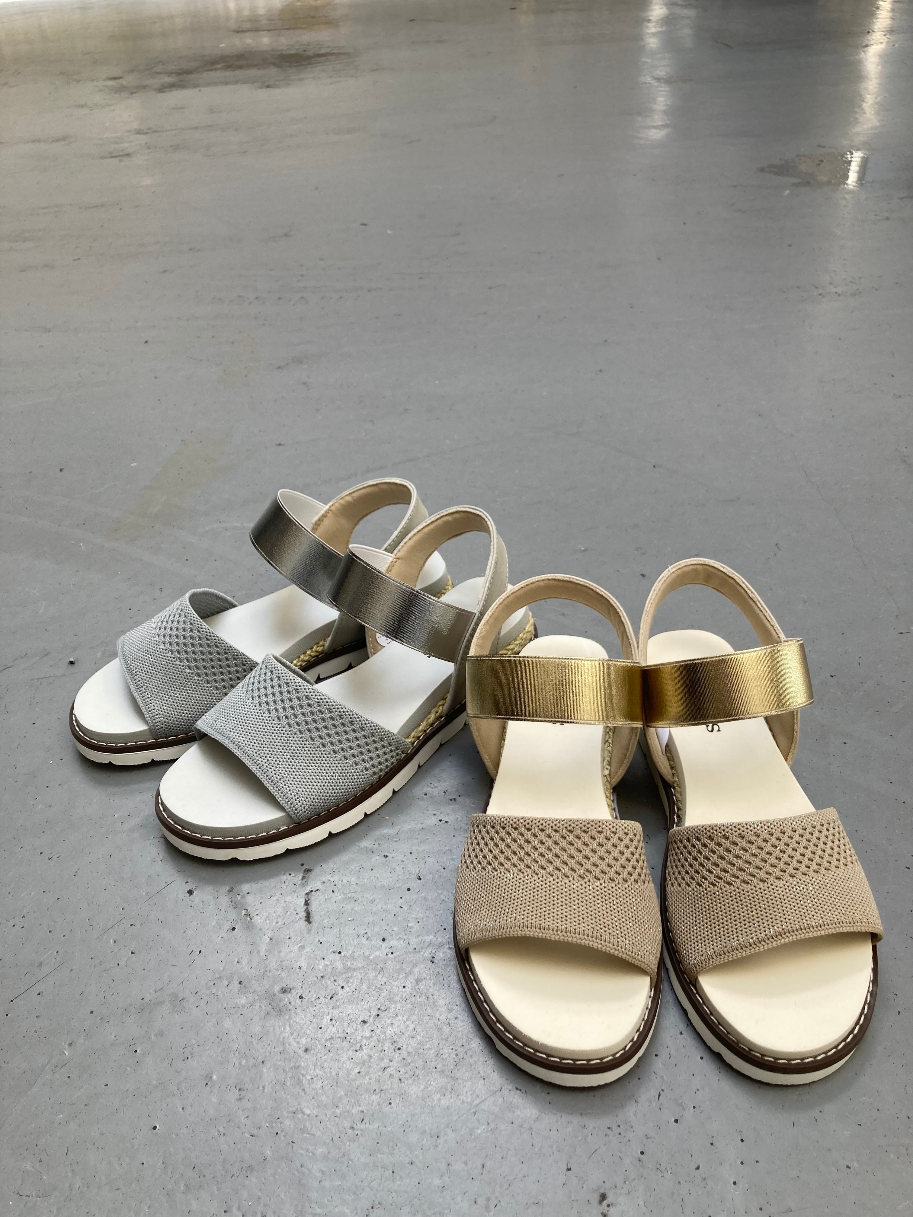 シンプルなデザインのフラットサンダル。前にニット素材を使い、イエローとゴールドの配色がお洒落です。お洋服の差し色にどうぞ!