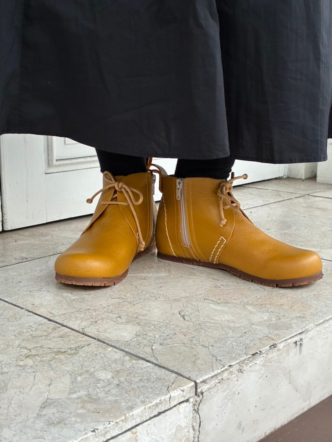 撥水レザー・オールウェザーソール使用。雨の日にも雪の日にも対応する新素材ソールを使っております。シンプルでショート丈なので冬だけではなく長いシーズンでお使い頂けるデザイン。お色も可愛いイエローで差し色にも使いやすく、お洒落!5cmのインソールヒールなのでスタイルアップし、ペタンコよりも歩き易いとのお声が多い商品です!当店人気の1足☆お色違いで黒もございます。