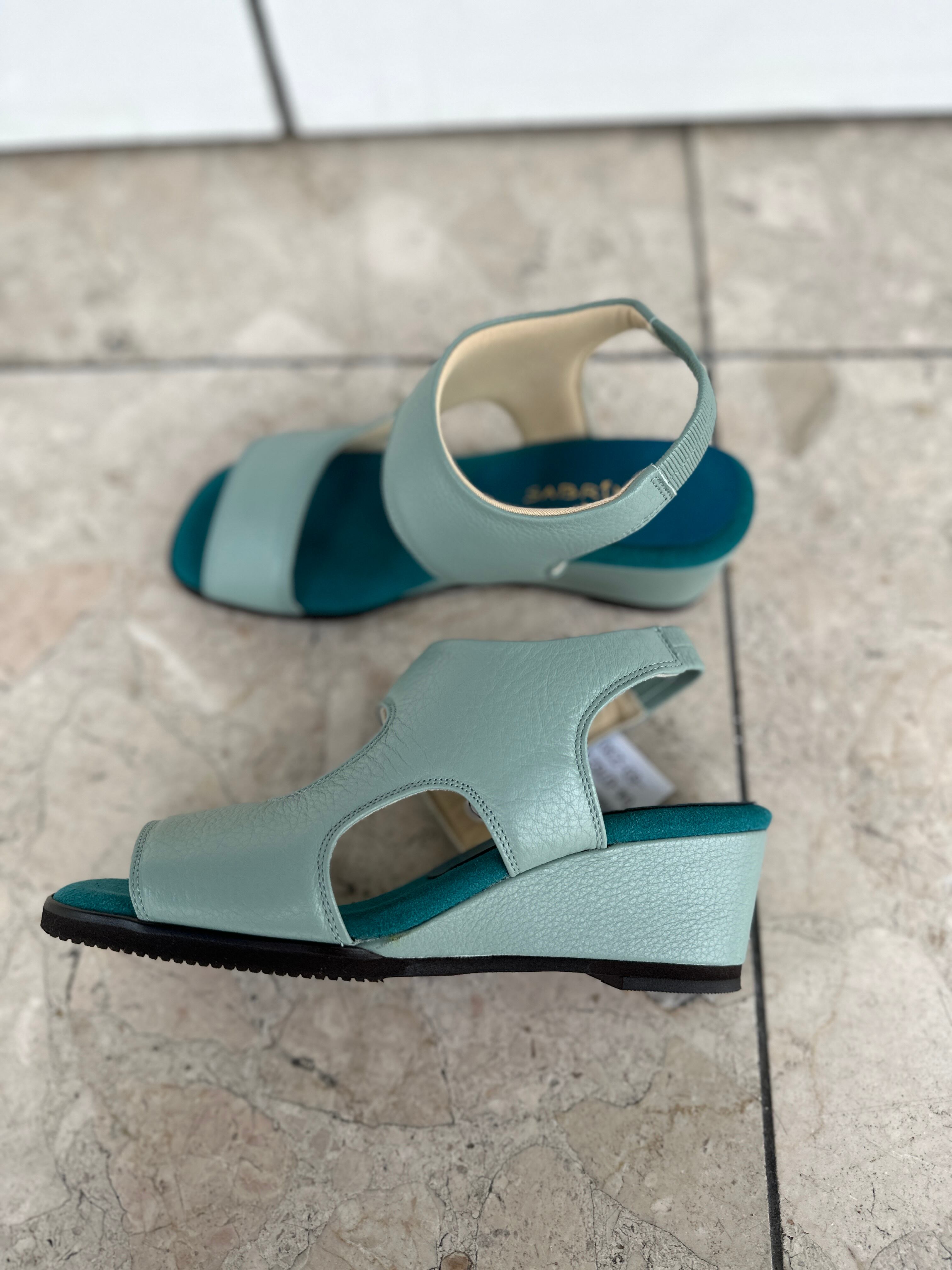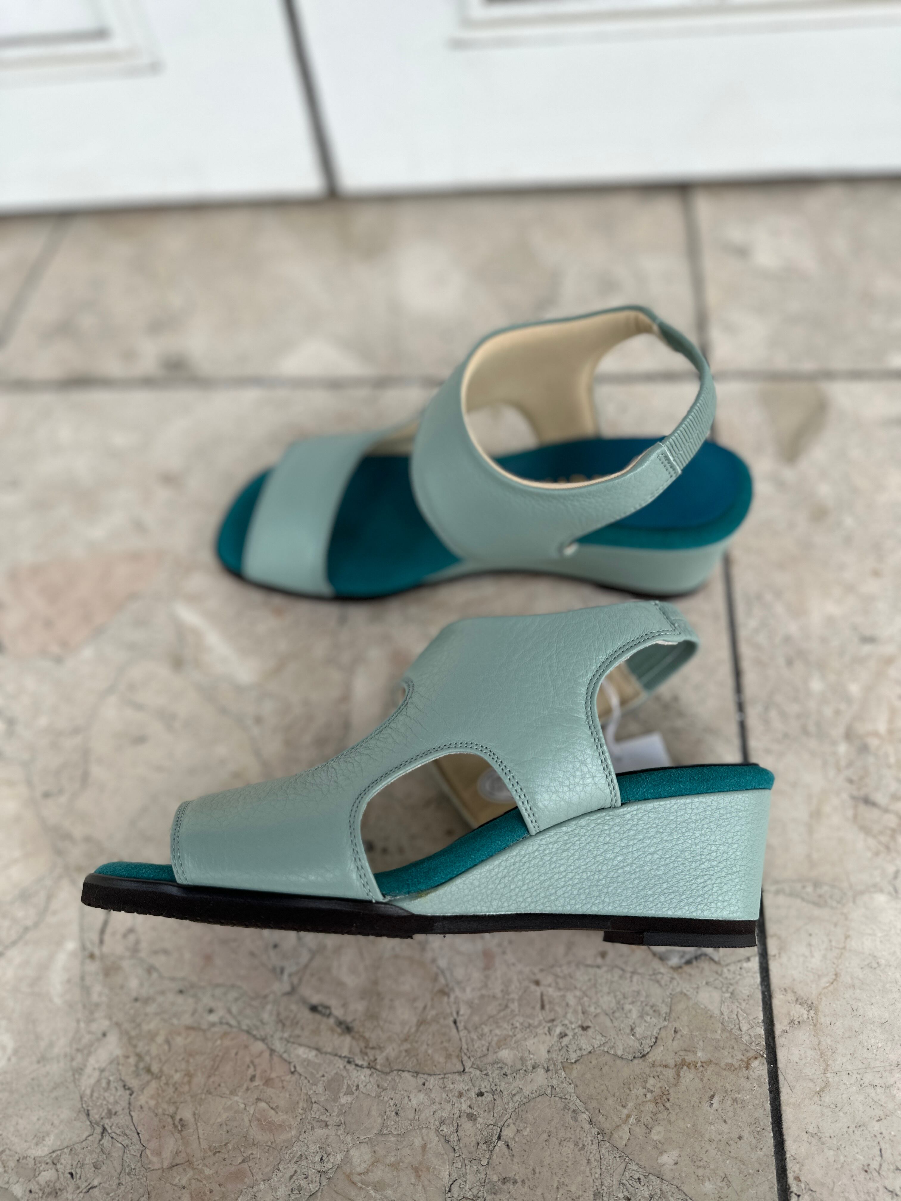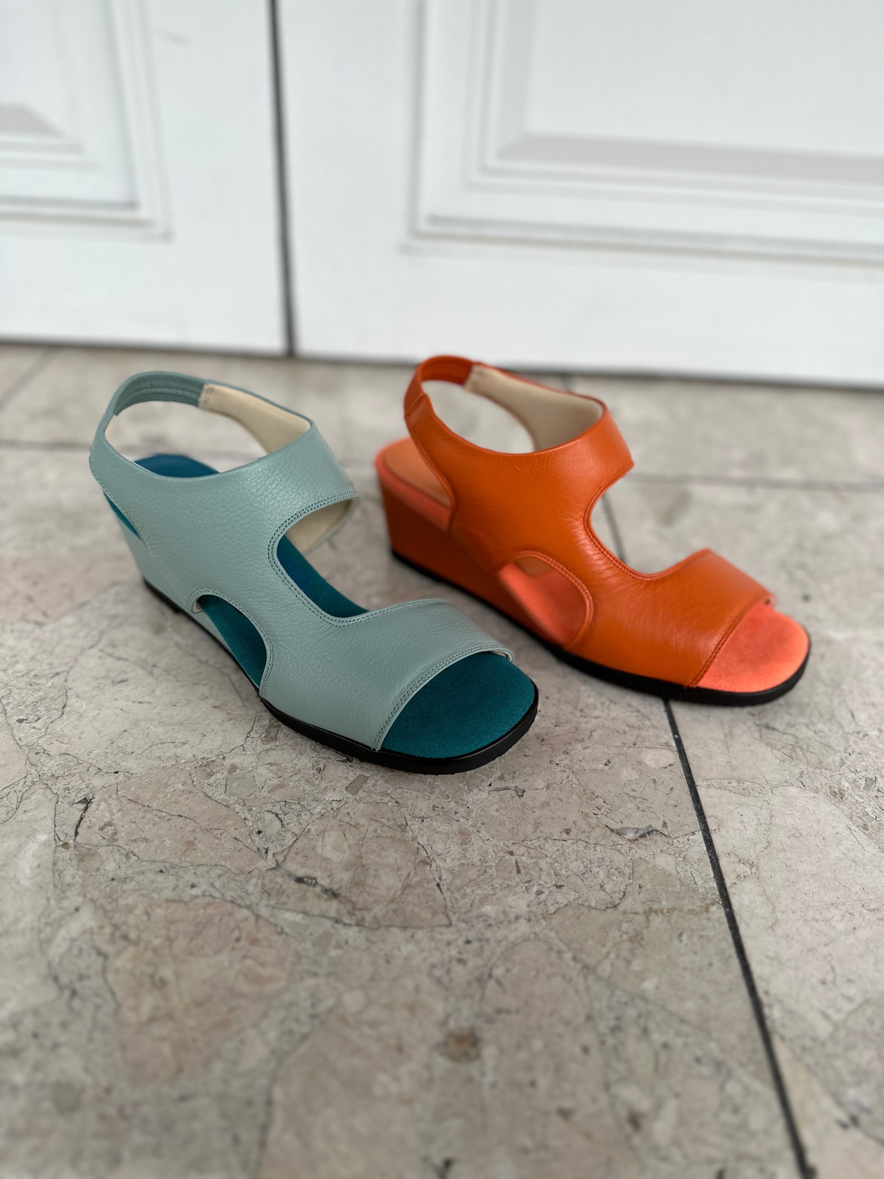 肌が綺麗に見えるミントグリーンのサンダル。こちらのパデッドサンダルは、超軽量でお作りし、5cmヒールでも傾斜をあまり感じないお作りなので、久々にヒールを履く方にもオススメ!幅も広めです。意外と合わせやすいお色ですので、挑戦してみて下さい!お色違いでオレンジもございます。