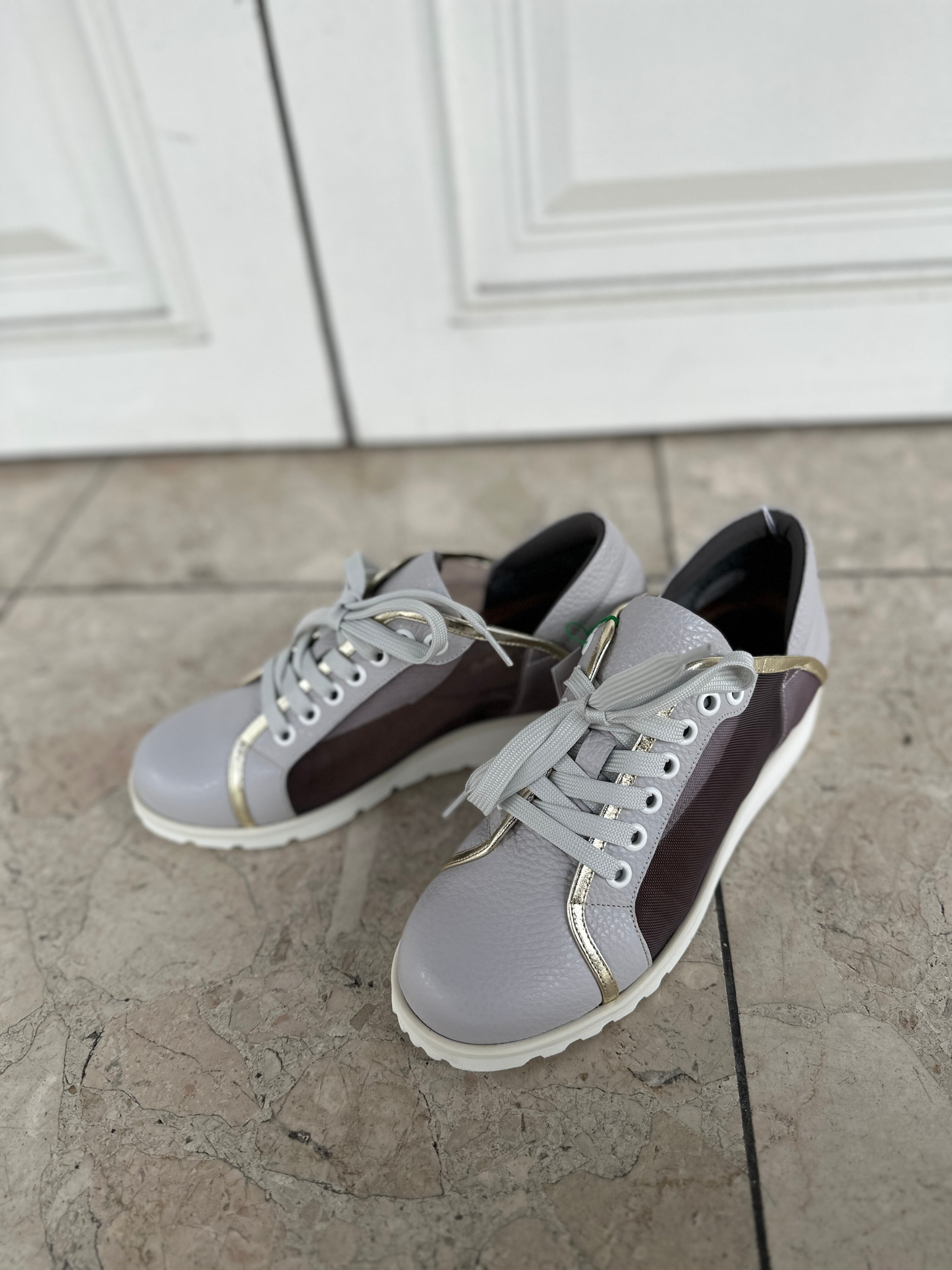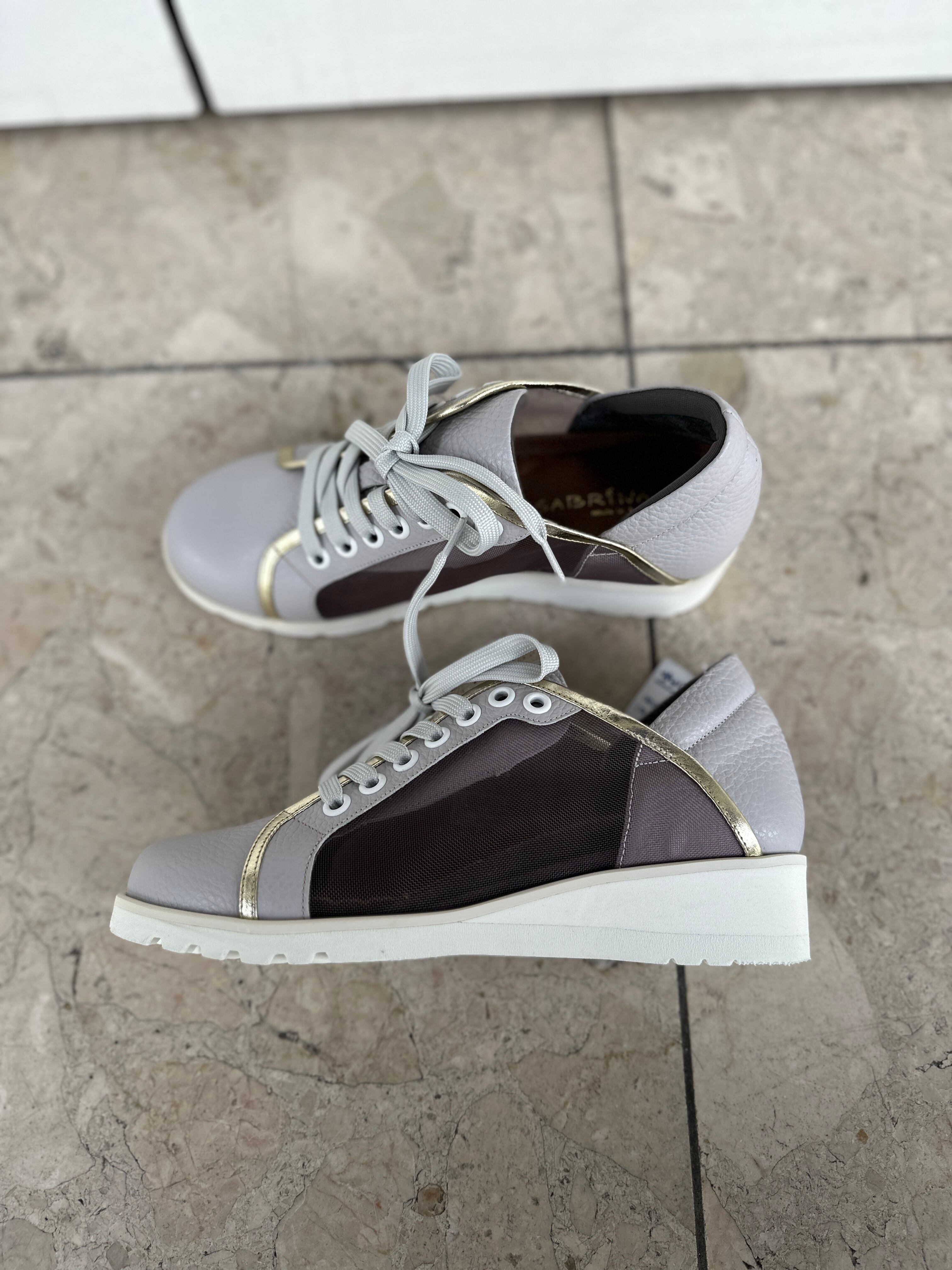 レザー✖️チュールデザインのスニーカー。ビックリするほど軽量で、カップインソールの中敷もフワフワ!足当たりの良いスニーカーです。今期注目のチュールデザインは夏でも暑苦しくなく、サンダル代わりにもgoodな1足。百貨店でもご好評頂いた商品です!優しいお色のグレーパープルは合わせやすいお色で履くと華やかです!