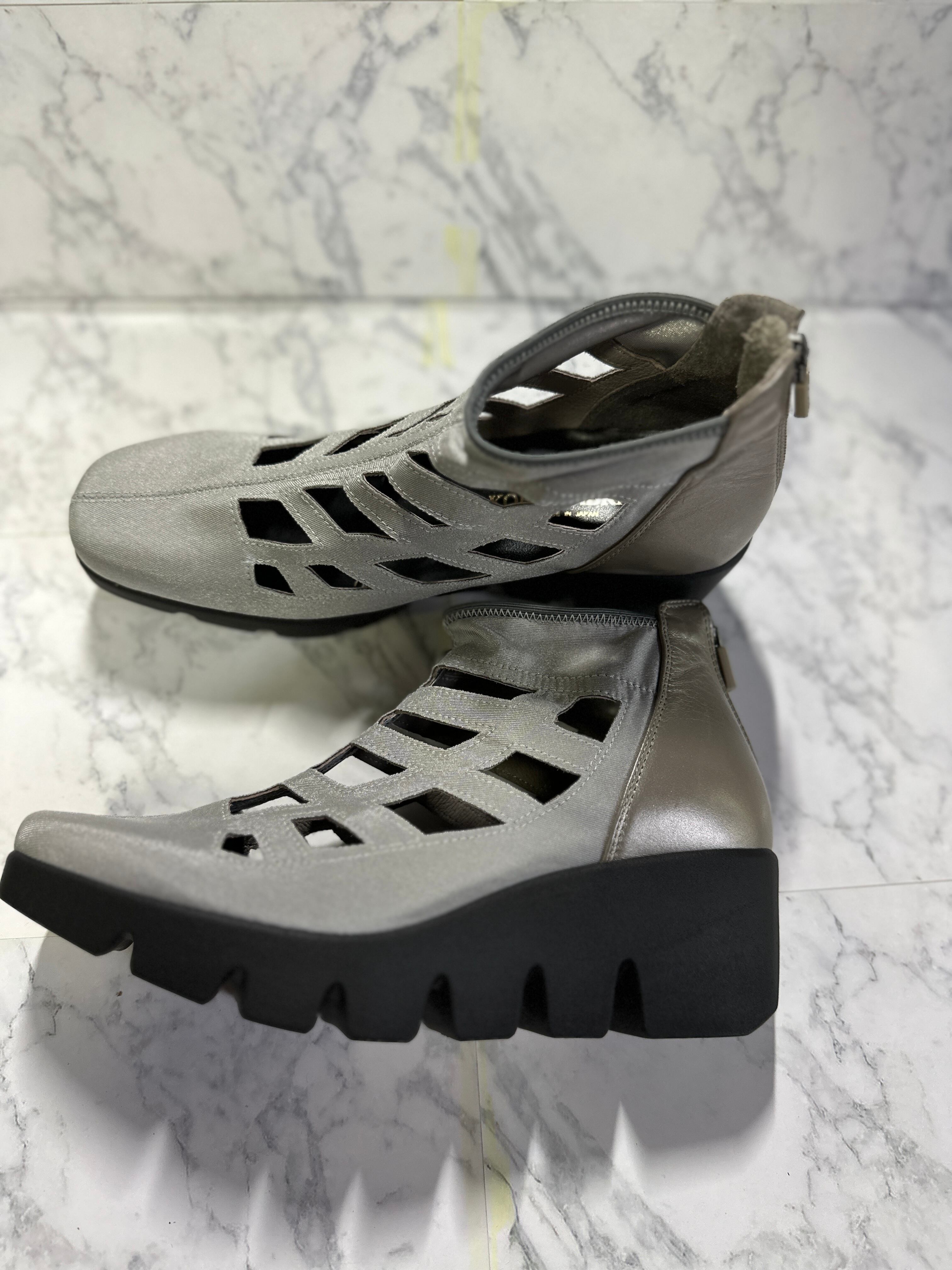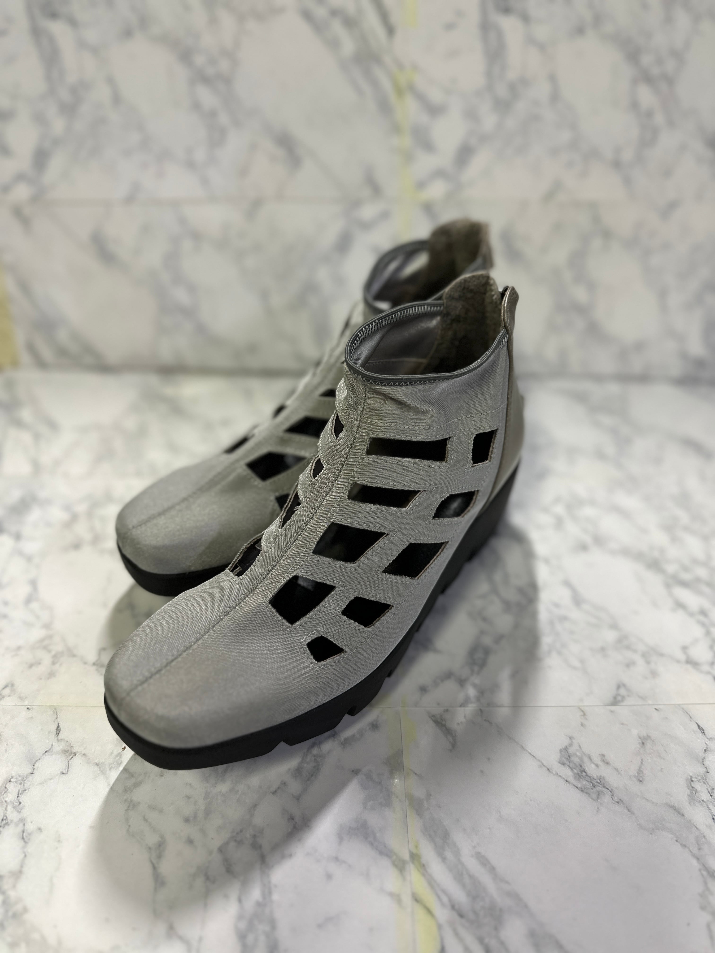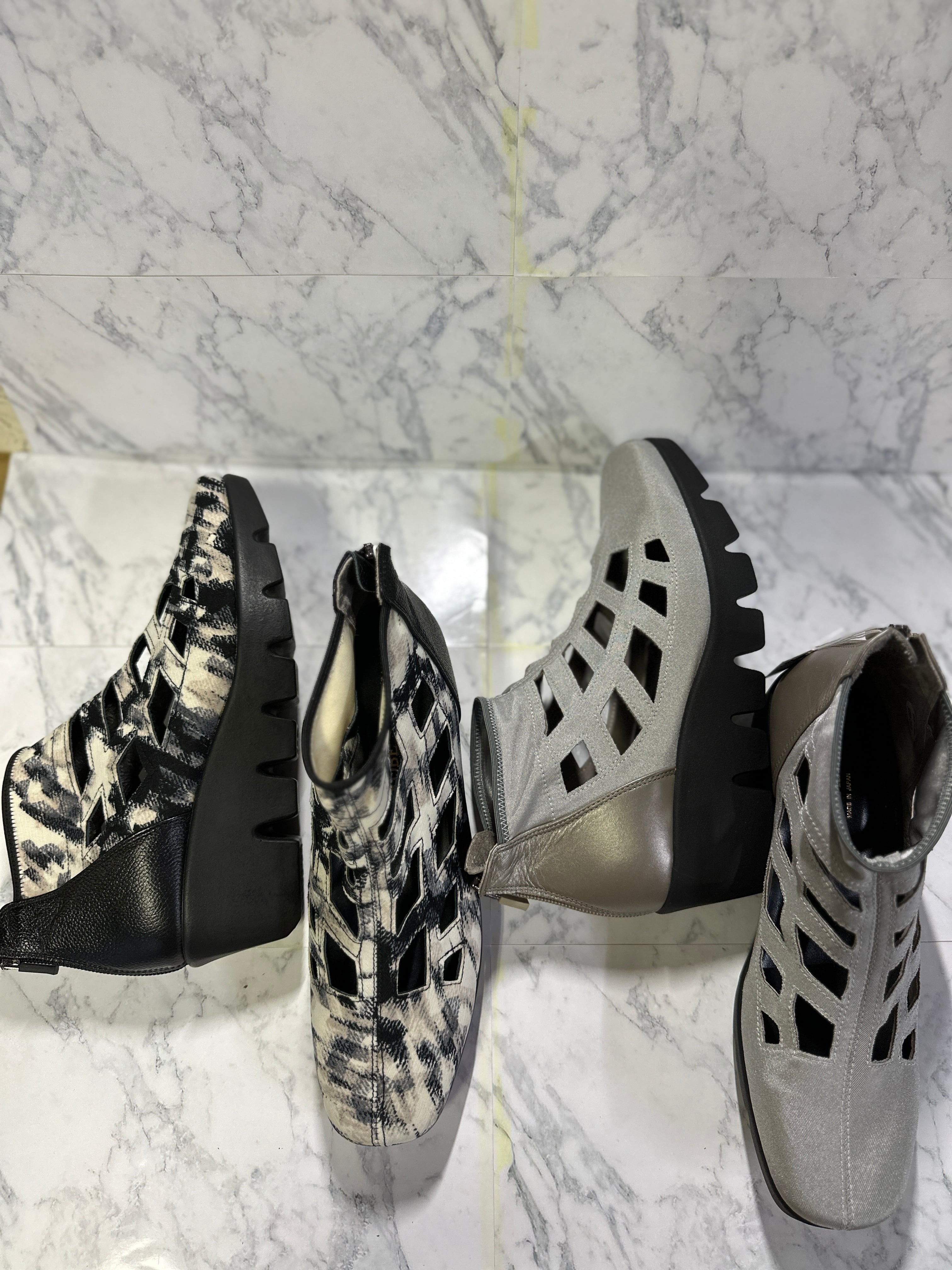 サブリナ定番デザイン!主にストレッチ素材でお作りし踵部分にレザーを使用。厚底が地面を拾わず足裏が楽で、ハイカットな為、安定感も◎サマーブーツとしておりますが、靴下を合わせれば長いシーズンでご使用頂けます。大きめのサイズ感となっております為、ワンサイズ小さめをオススメいたします。お色違いもございます。