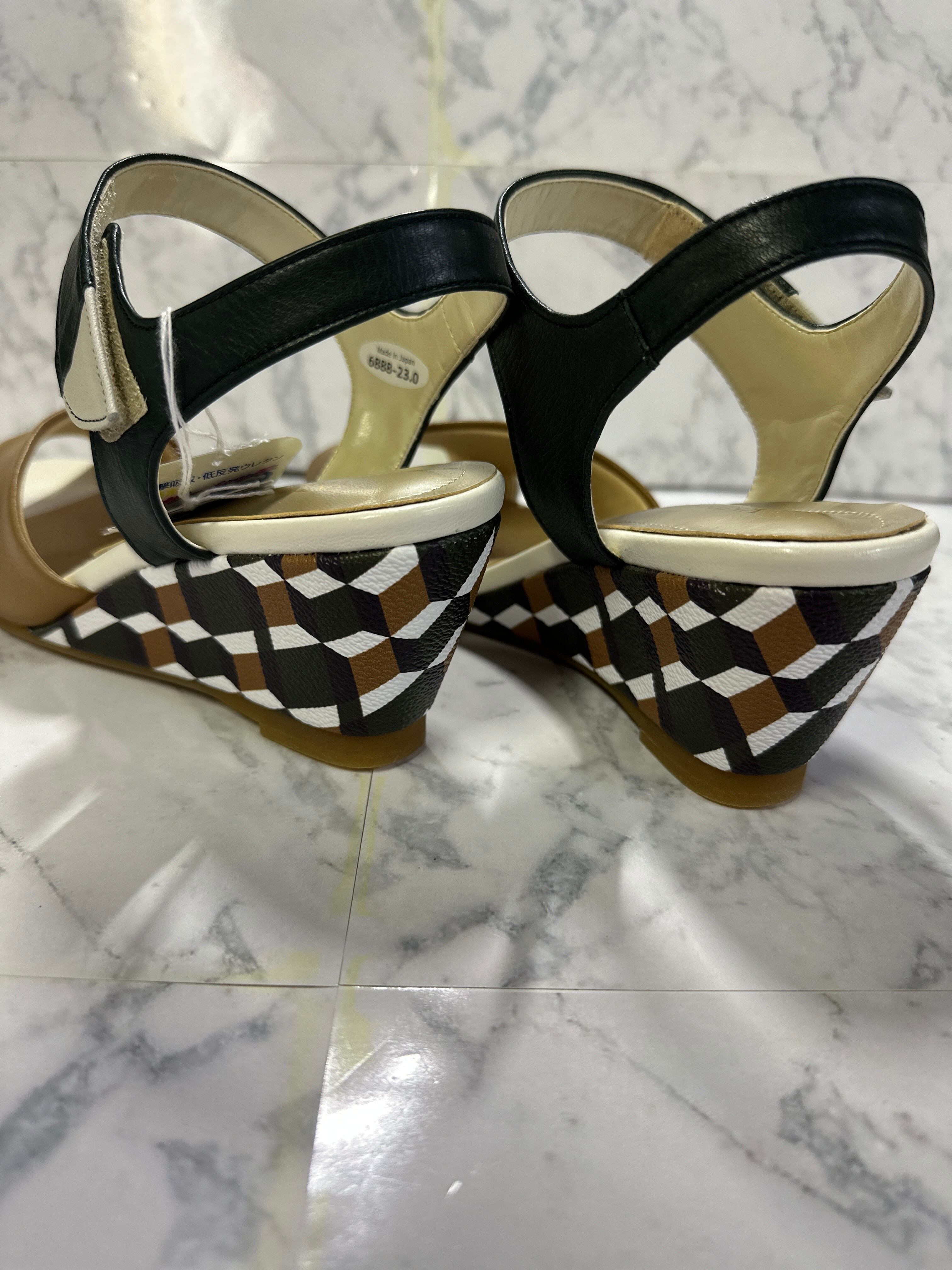 革巻きヒールにプリントがお洒落なサンダル。マジックテープ先のベルトで足首を固定出来るので、安定感、安心感のある歩きやすいサンダルです。一色ではなく、グリーンや白もポイントに使っているのでカッコよくお洒落な1足!