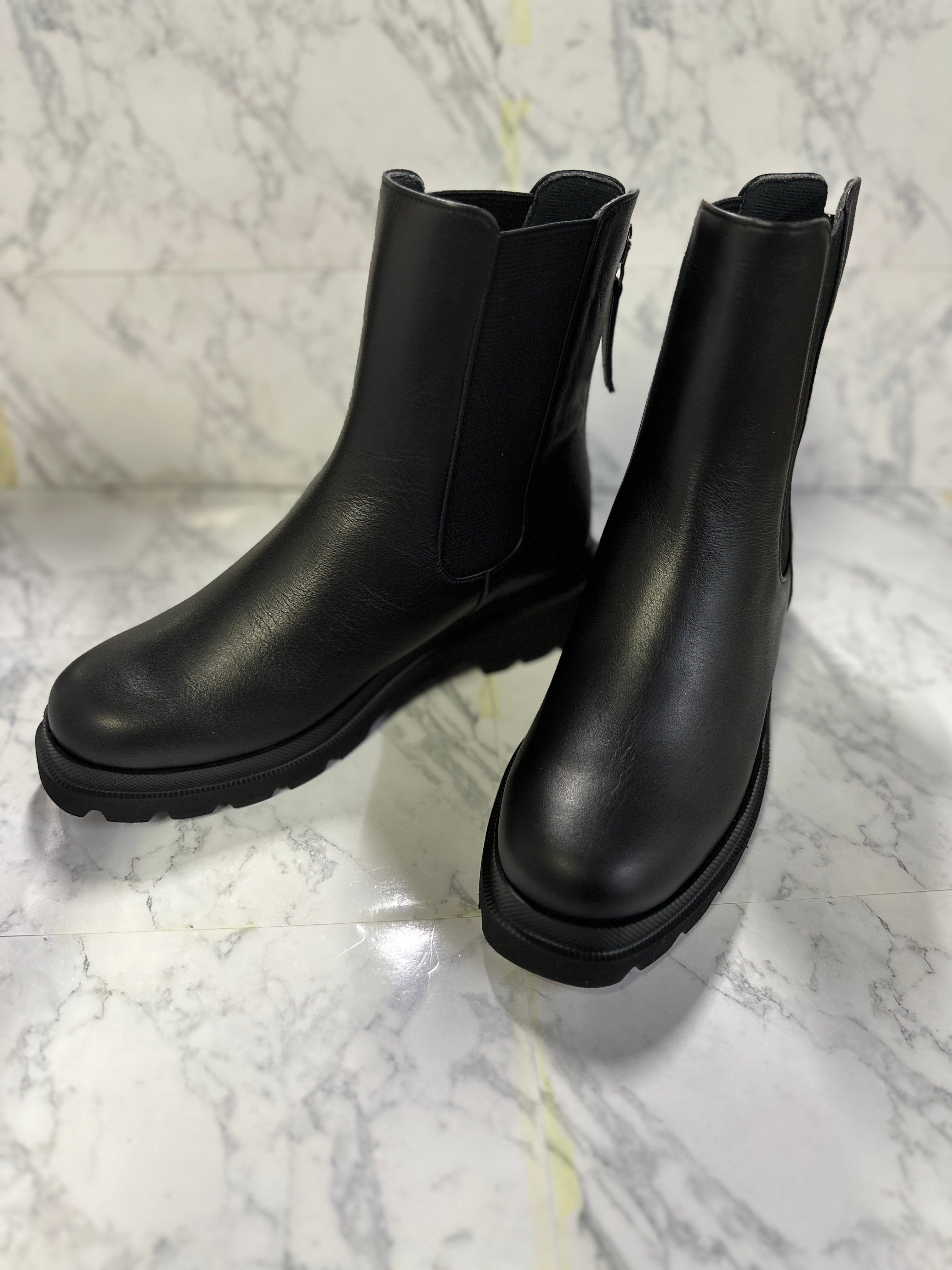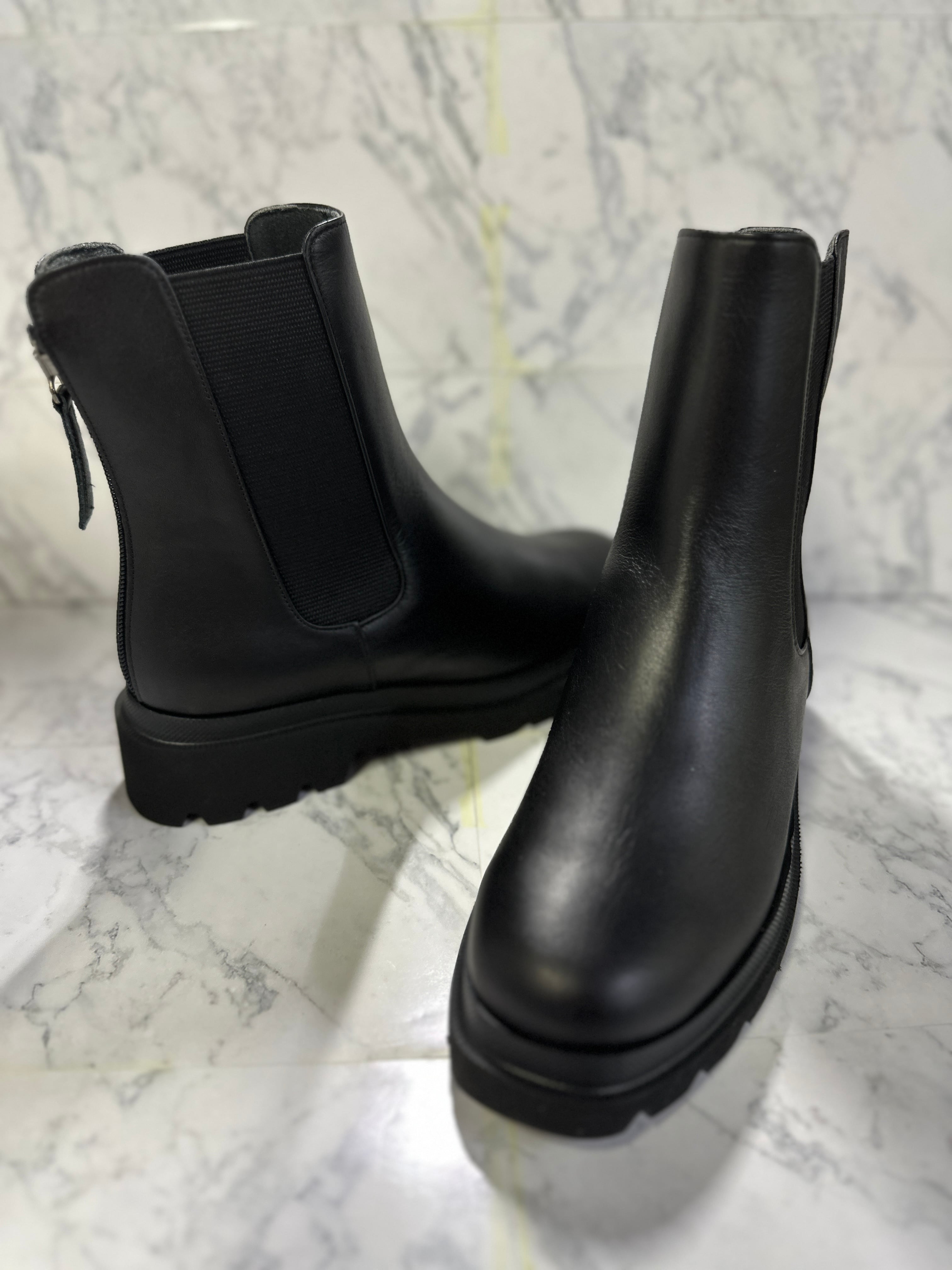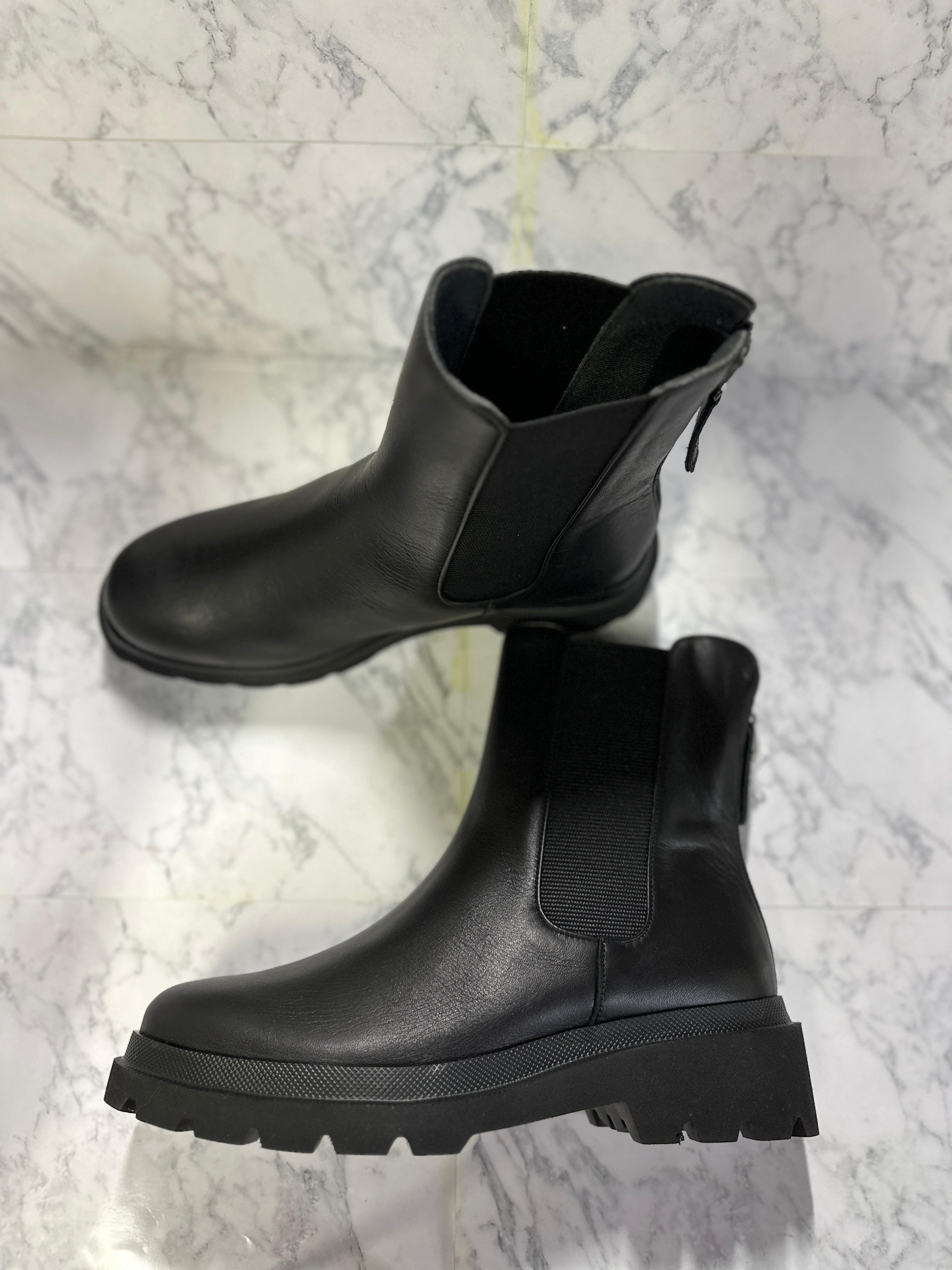 只今流行中のチェルシーブーツ。チェルシーブーツとは、くるぶしよりも長めの丈感でサイドに太いゴムが入ったデザインブーツ。本来ならゴムの伸縮で脱ぎ履きするブーツですが、当社では後ろにファスナーを加え、より簡単に脱ぎ履き出来るデザインに仕上げています。クリッピング(甲部分から足首に掛けての曲線を継ぎ目なく一枚革で作成する)を施す事で高級感が出て、美しい仕上がりとなっています。