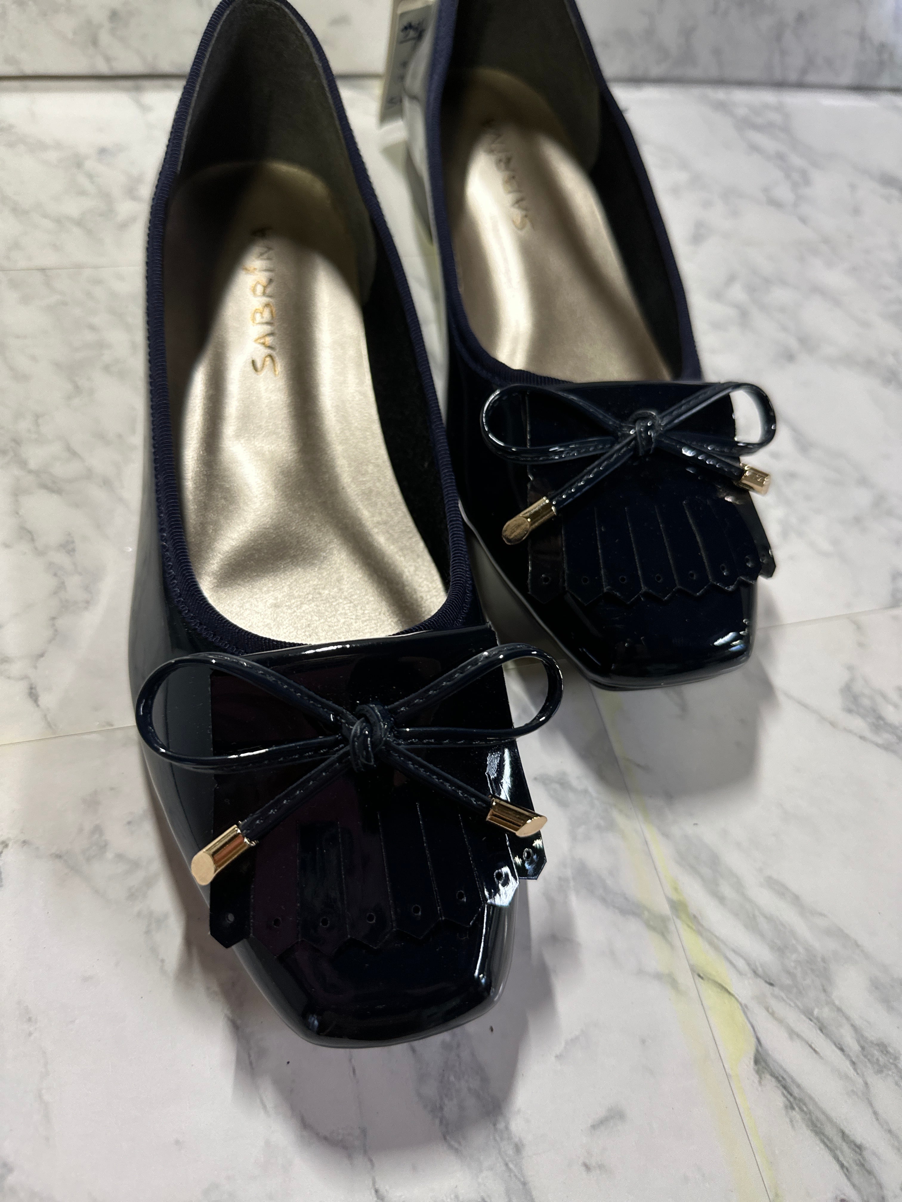 再入荷しました!ローファーの様なデザインのフラットシューズ。珍しいネイビーが可愛く、お洒落!小さなリボンもポイントになっています。雨の日もお使いいただけるので便利です。