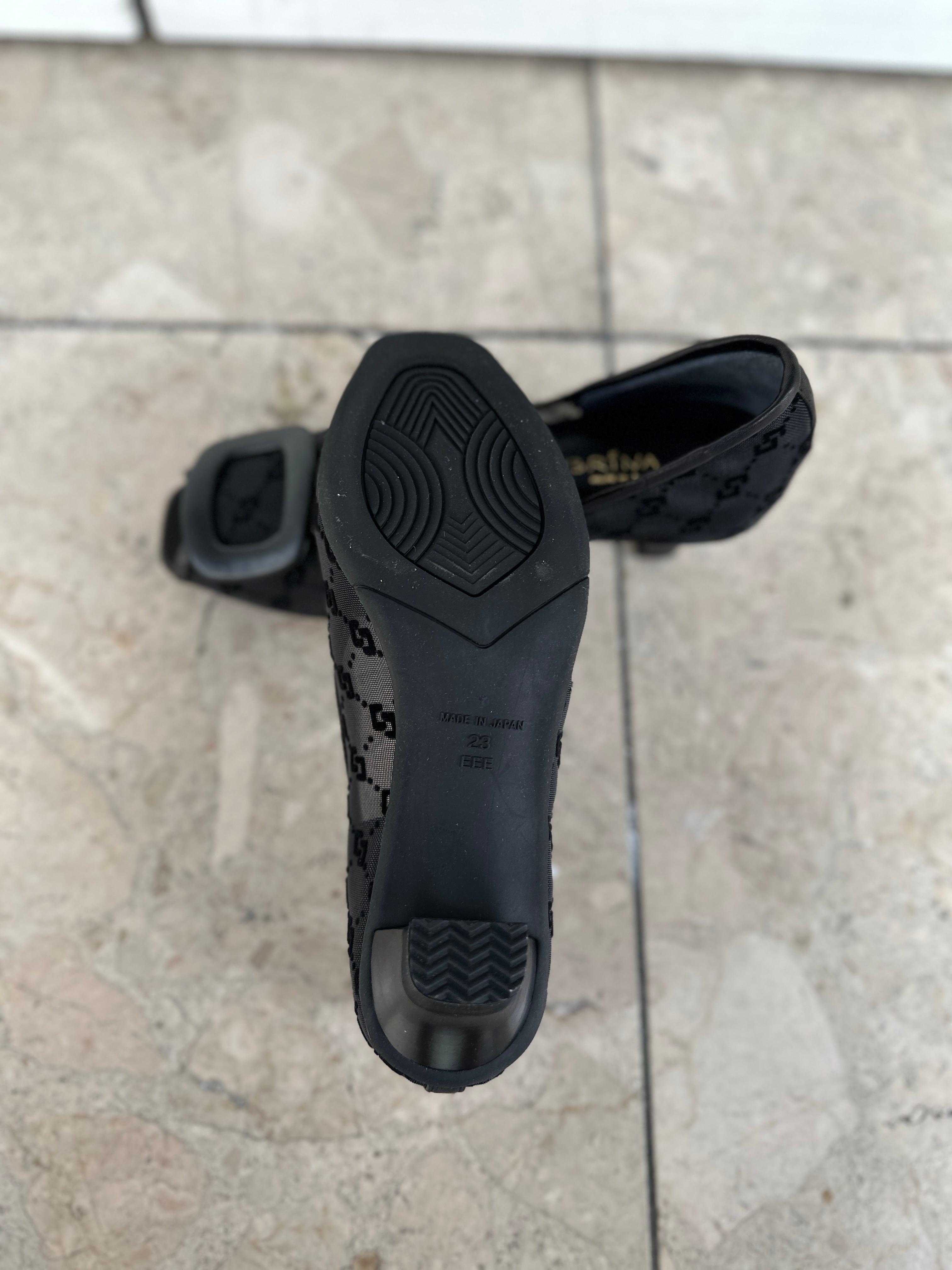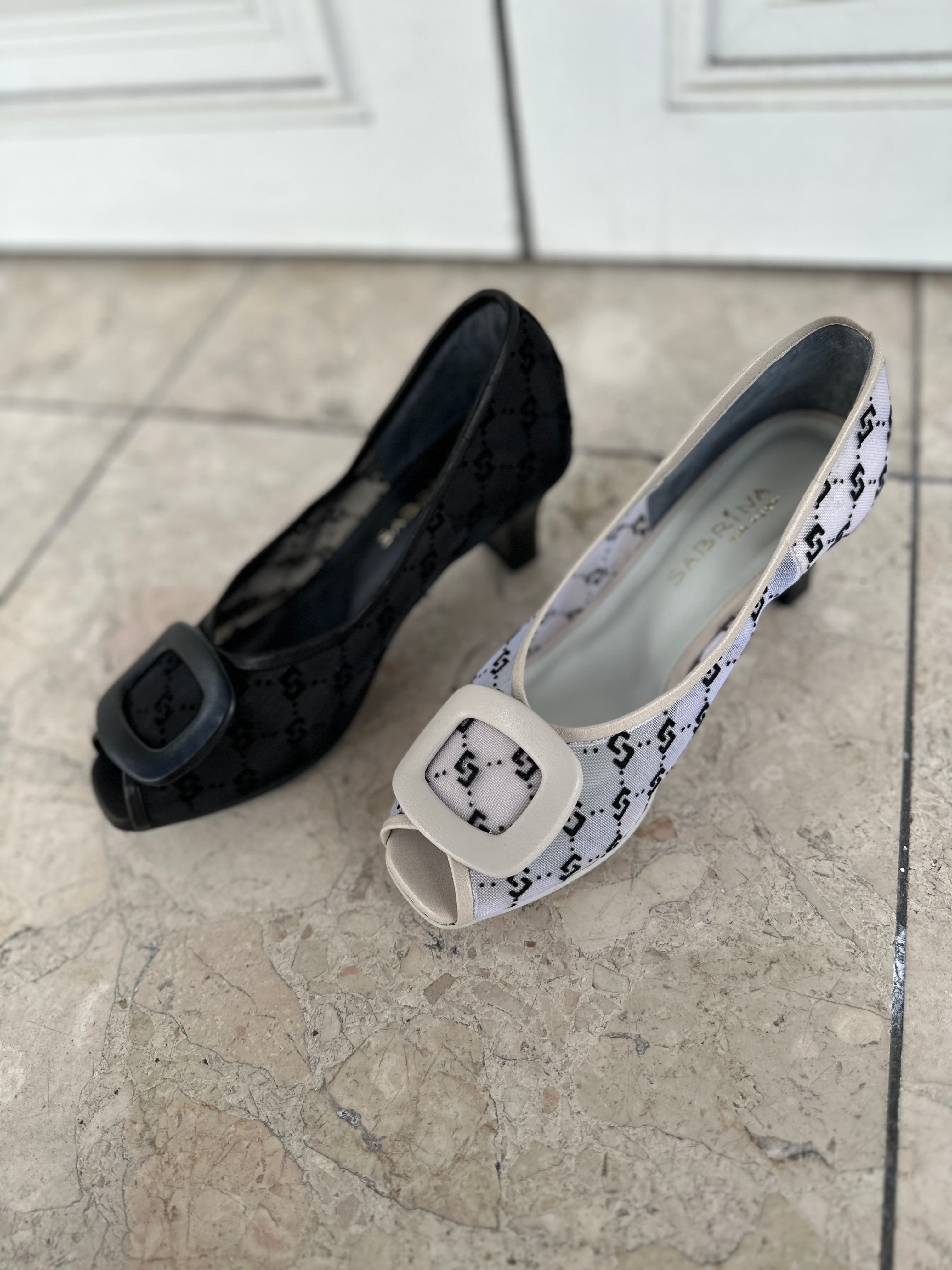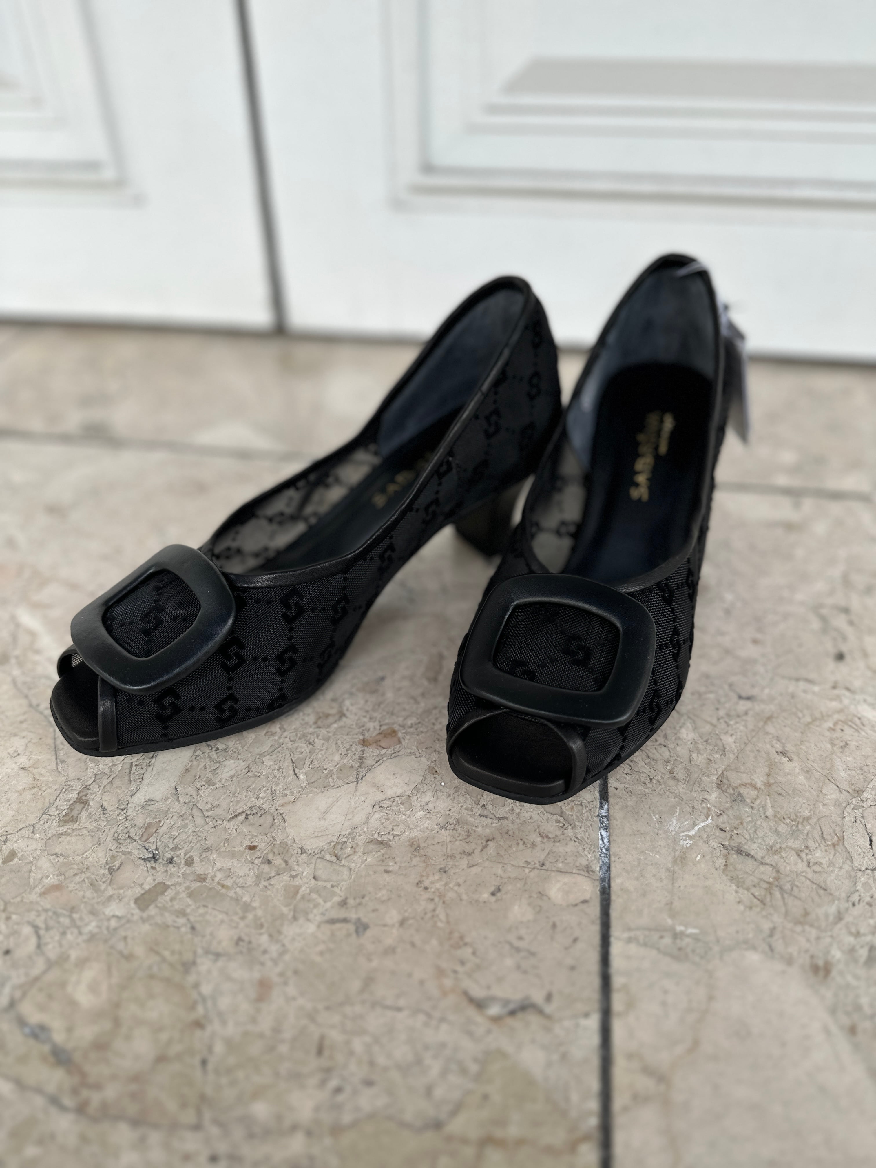 プリント加工をしたチュール素材にレザーで作ったバックルを付けました。履くととても綺麗に見えるシルエットで、なかなかお洒落な1足!中敷・ヒール共にクッション性もよく、消音タイプ。つま先の返りも抜群に良いです。春夏はサンダルの代わりに、秋はタイツと合わせてモダンにお使いいただけます!