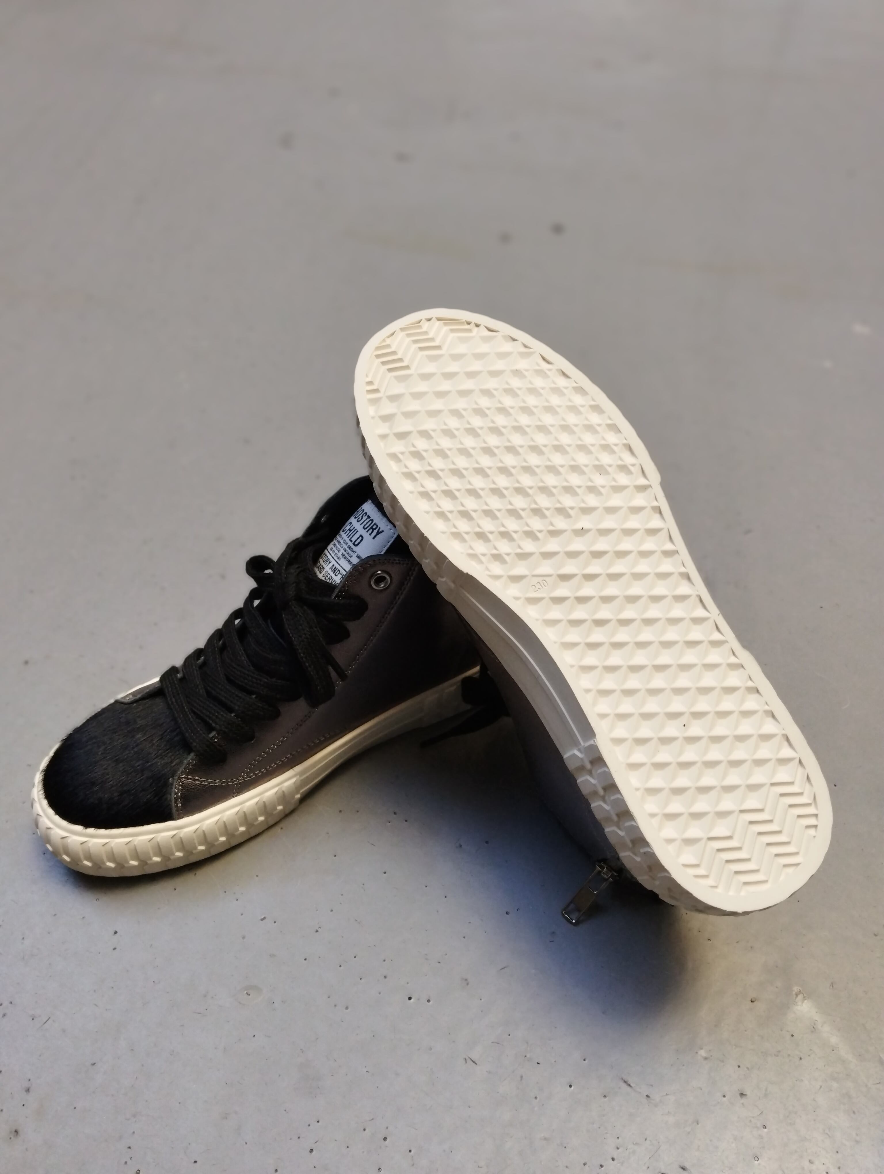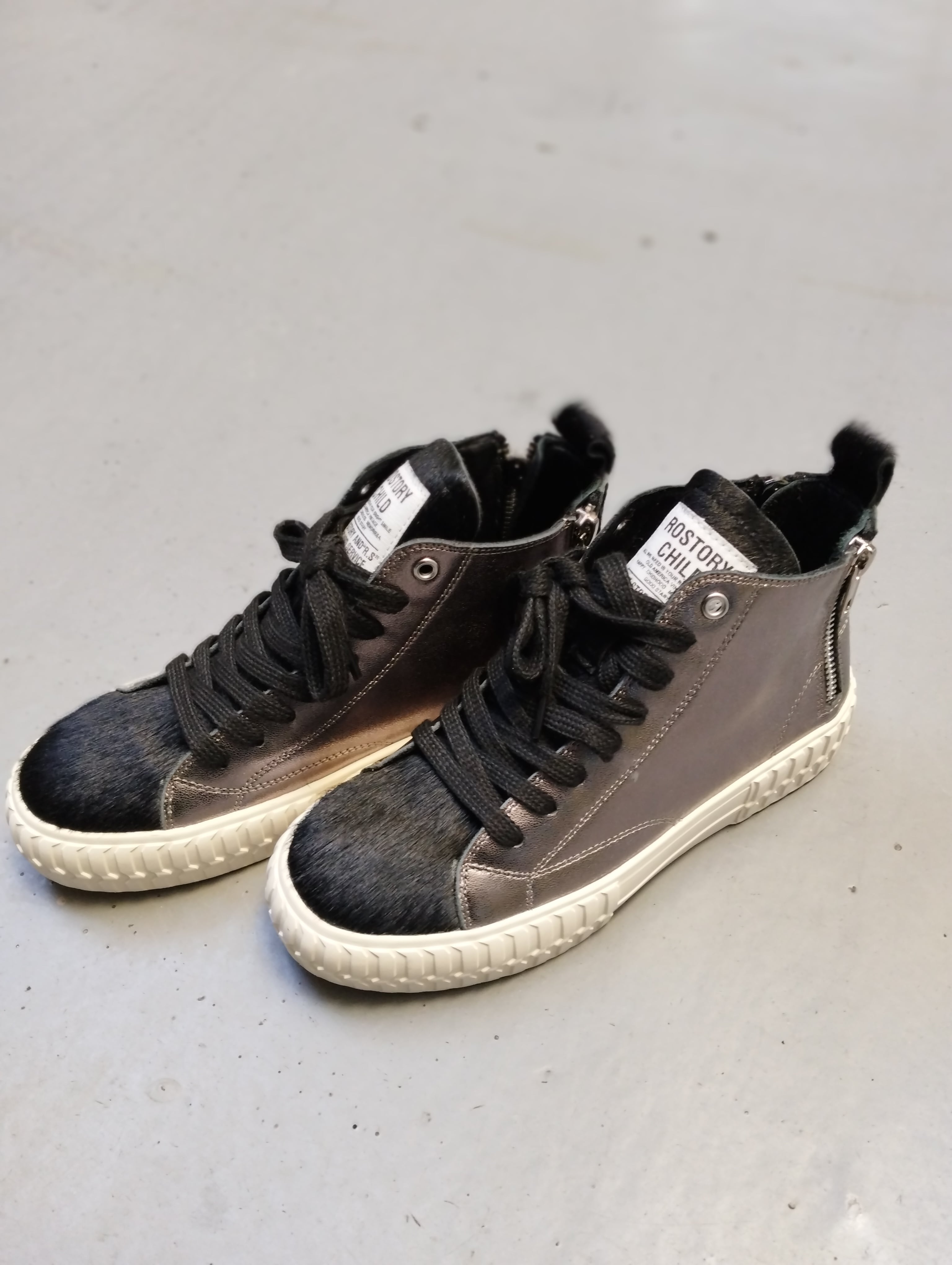 ハラコとレザーのコンビのハイカットスニーカー。両サイドのジッパーで脱ぎ履き楽々。お色はメタリックスムースレザーとクロハラコの組み合わせで大人カジュアルな逸品!スニーカーが苦手な方にも履いて頂きたいシューズです!☆お色違いでクリームもございます。