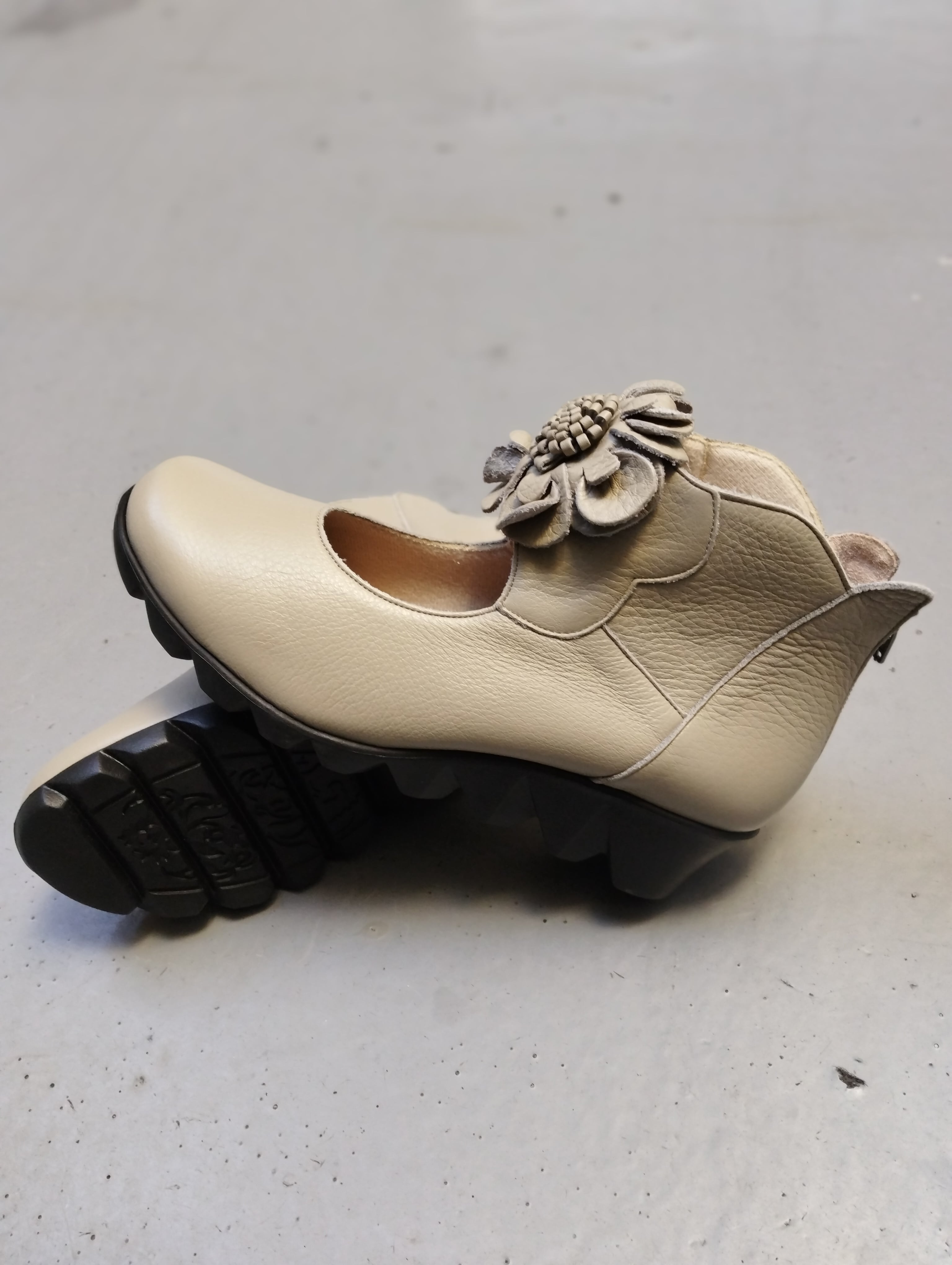 花のモチーフでおしゃれなデザインが魅力なカジュアルシューズ。ソフトな牛革を使用したアッパーと軽量パイロンソールの組み合わせで、長時間の着用でも快適な履き心地でお薦めです。また、バックファスナーが付いているため、脱ぎ履きも簡単で便利です。落ち着いたオークカラーで、カジュアルなスタイルにマッチします。一足持っていると様々なコーディネートに活躍すること間違いなしです。