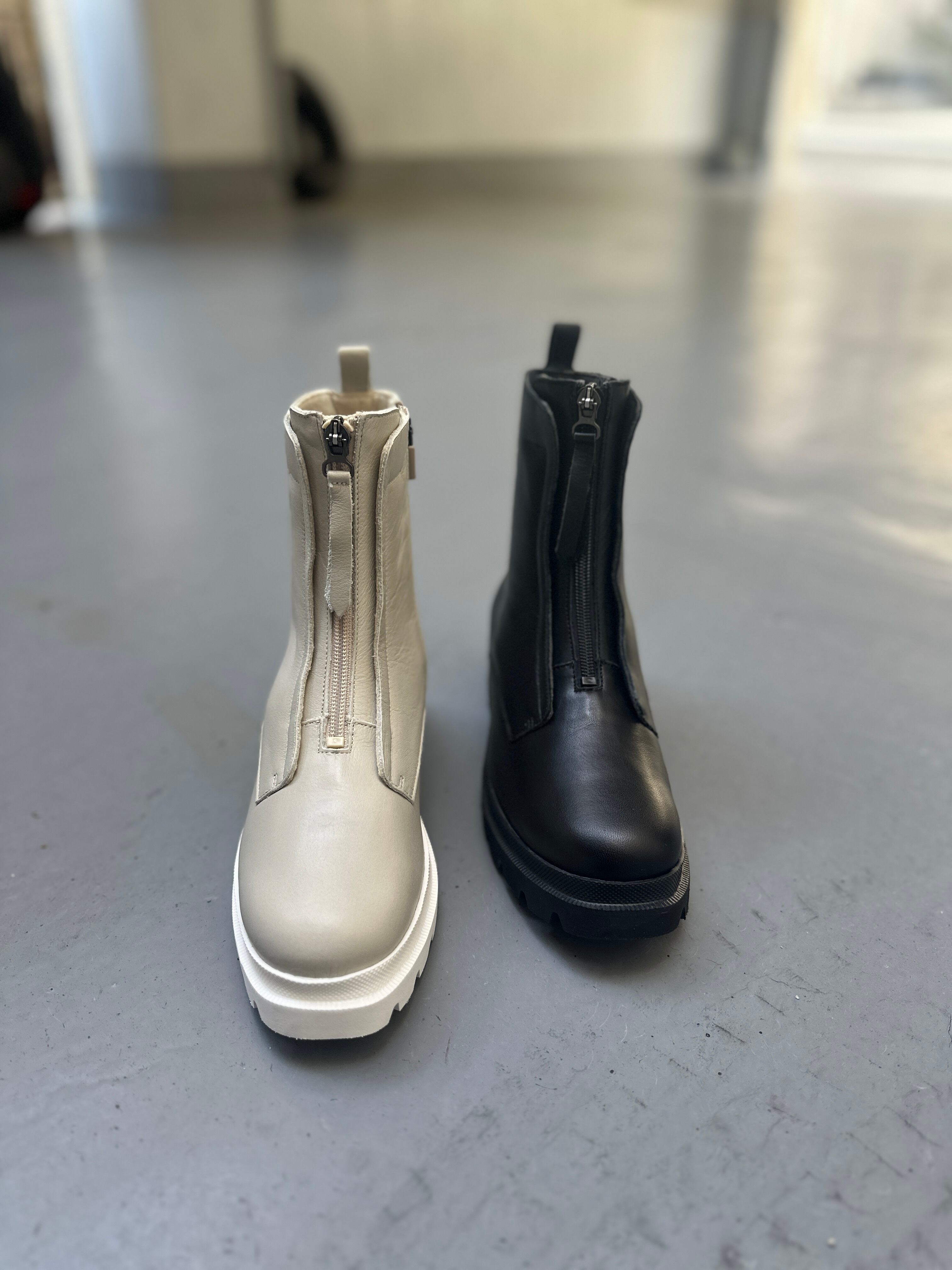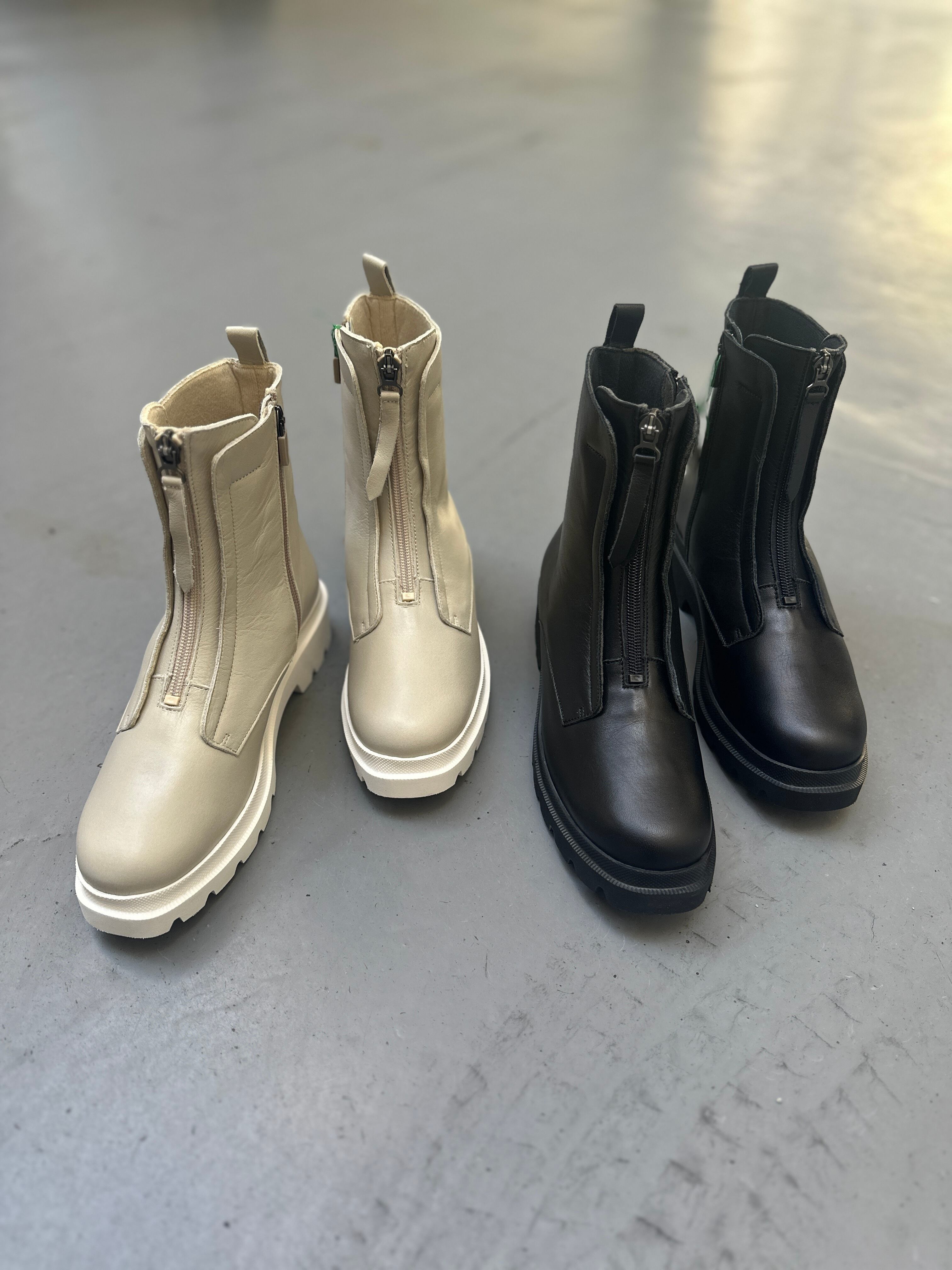 只今流行中のブーツ。ファスナーデザインなので、逆にスッキリとしたシルエットになり、見た目もお洒落!今期一推し商品!バックファスナーで脱ぎ履き可。スッキリと美しいシルエットです。厚底ですがかなりの軽量で、クッション性も良くお洒落で履きやすい1足!お色違いでクロもございます。