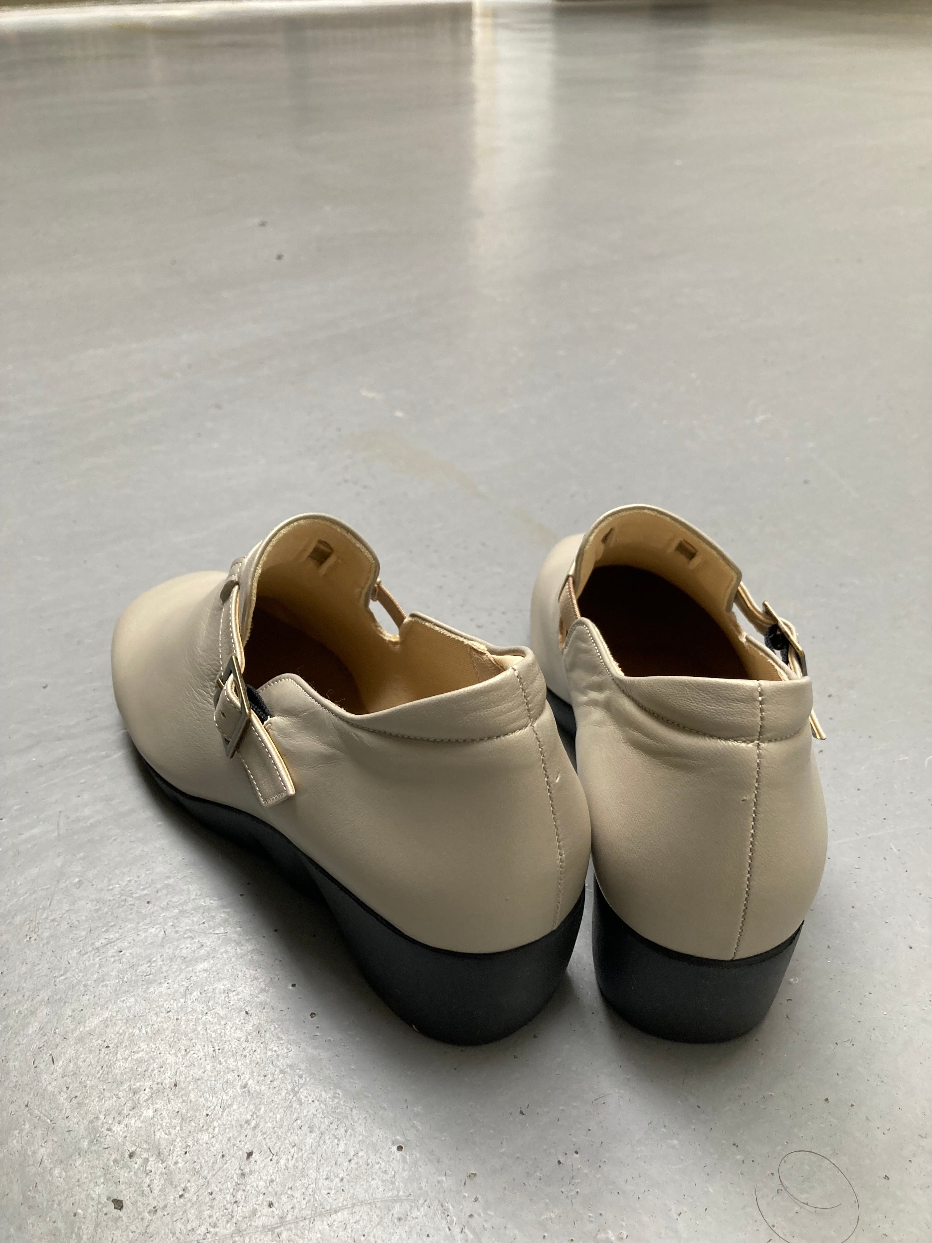 柔らかいレザーと、とっても軽いソールを使用したサブリナ定番のスリッポンです。3E表記ですが4E程の幅で甲に厚みのある1枚革デザインなので、外反母趾の方にも是非おすすめしたいデザイン!ベルト裏にはゴムを入れて伸縮性を良く、ベルト調整可能。百貨店でも年中品薄状態の人気者!お色違いでクロ・プラチナもございます。プラチナはパールベージュの優しいお色です。