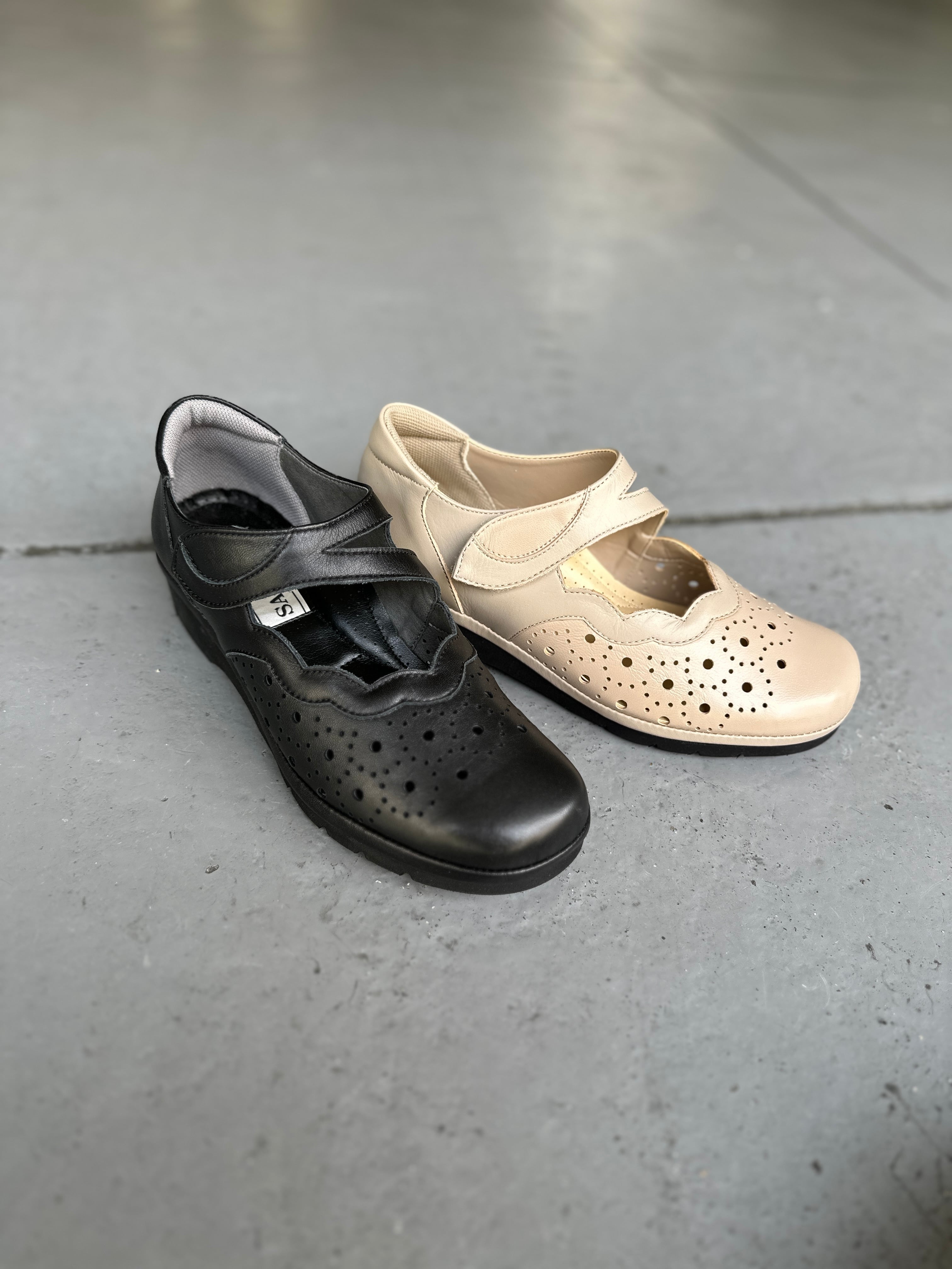 人気のラム革シリーズ。フラットなカジュアルソールにワンベルトを使用。外反母趾対応の抜群な履き心地!春夏仕様でパンチングデザインになっております。お色違いで黒もございます。