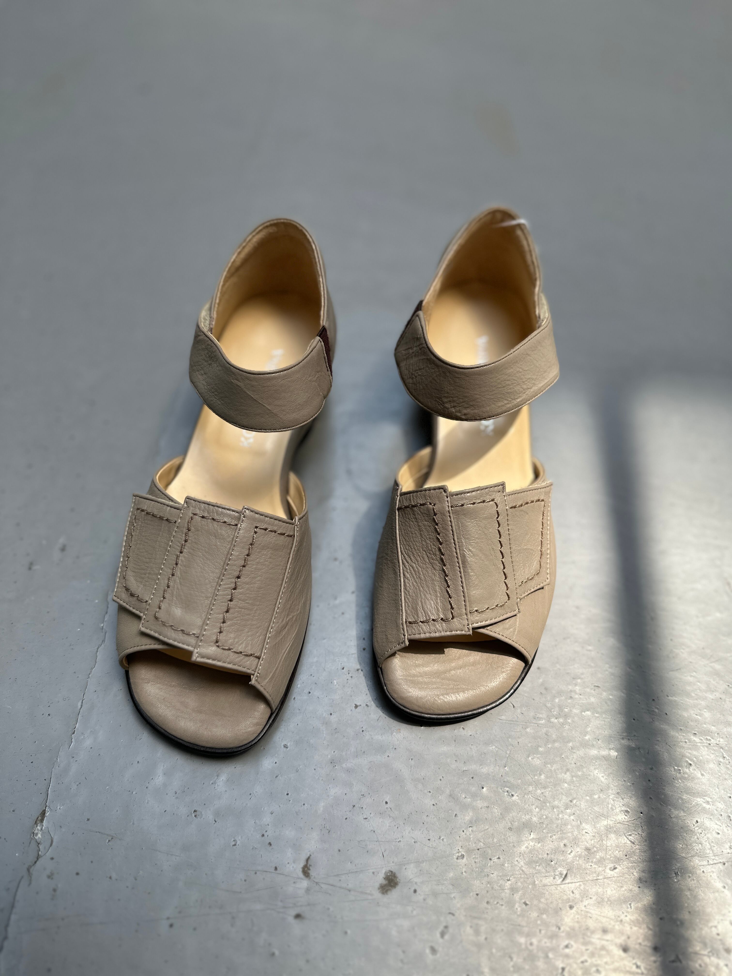 4Eの幅広サンダル。かかとのあるタイプで安定感もバッチリ!とても履きやすく飽きのこないデザイン。アッパー部分も調節可能。お色違いはクロ・ラベンダーがございます。