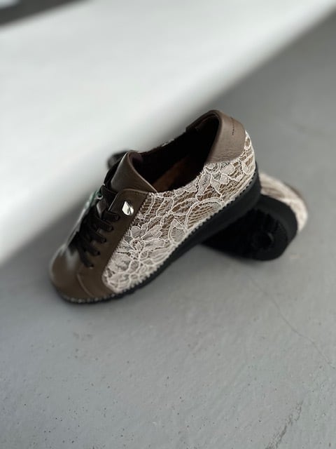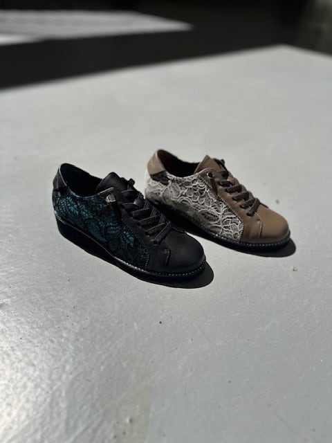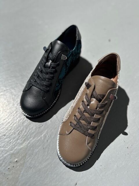 カップインソールで歩きやすいスリッポンです。前側は紐ではなく、ゴムを使用しているのでそのまま脱ぎ履き出来ます。しつこくない程度に華やかさをプラスしたお洒落なシューズです。