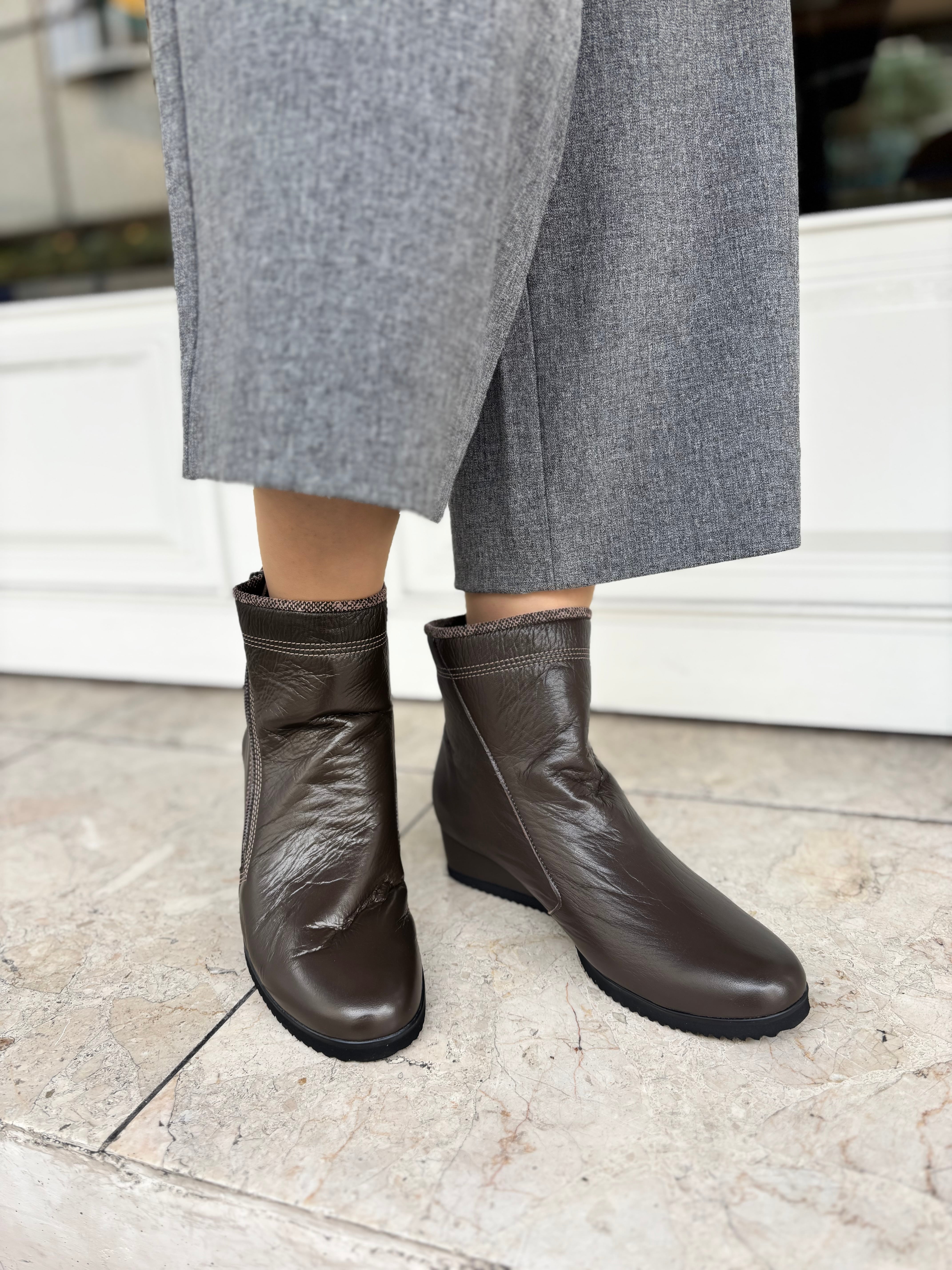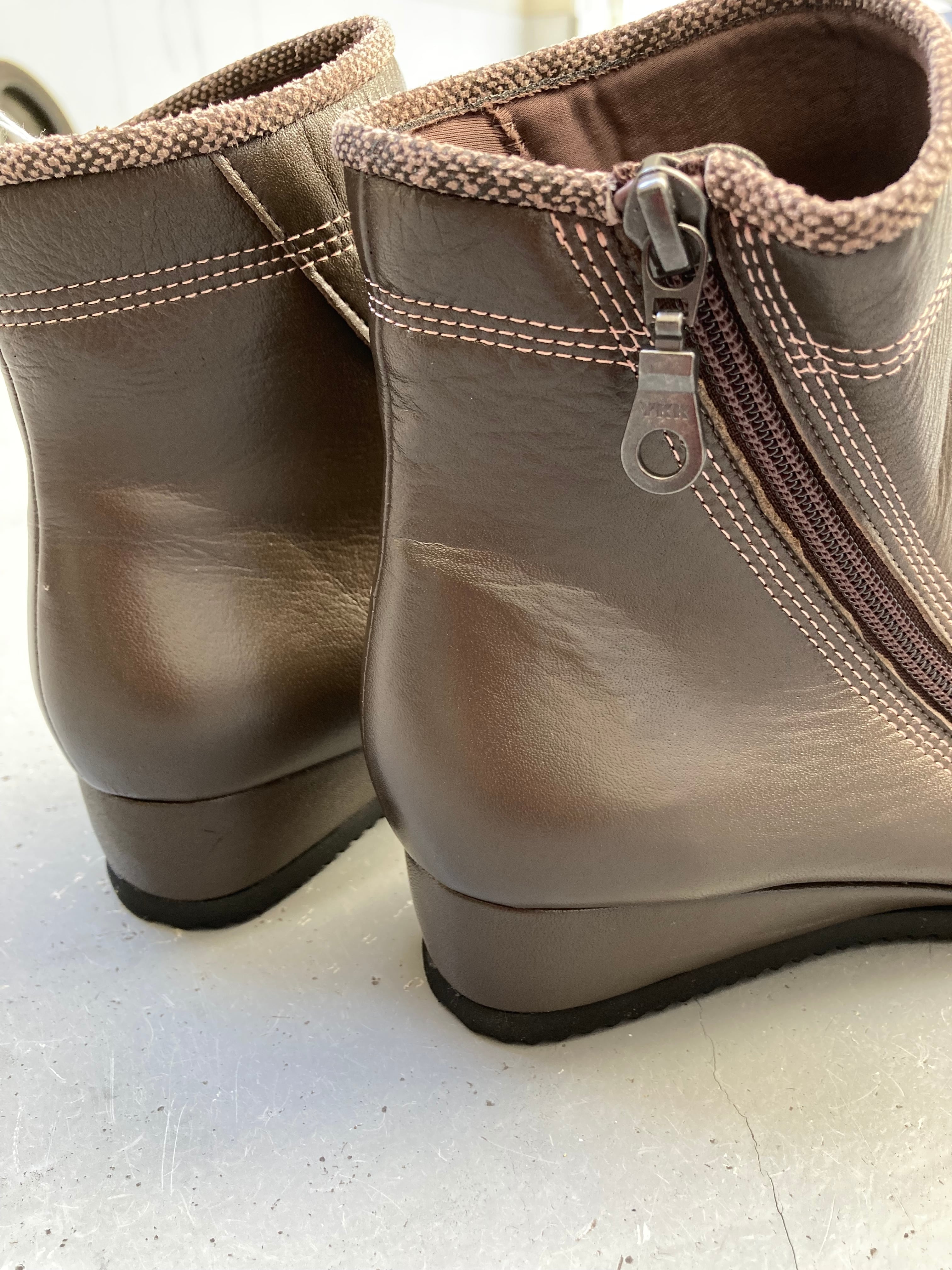 軽量で柔らかなレザーでお作りし、細く見えながらしっかり安心の幅広3Eです。外反部分などの痛くなりやすい場所に革の継ぎ目がなく、履きやすいと評判のブーツです。しっかり大きく広くファスナーで脱ぎ履きのストレスを軽減。シルエットも綺麗で、パイピングがアクセントになってgood!